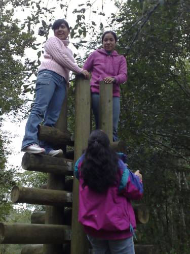 Tres Valientes Chicas Escalando Unos Troncos Dispuestos Para Ese FIn.
